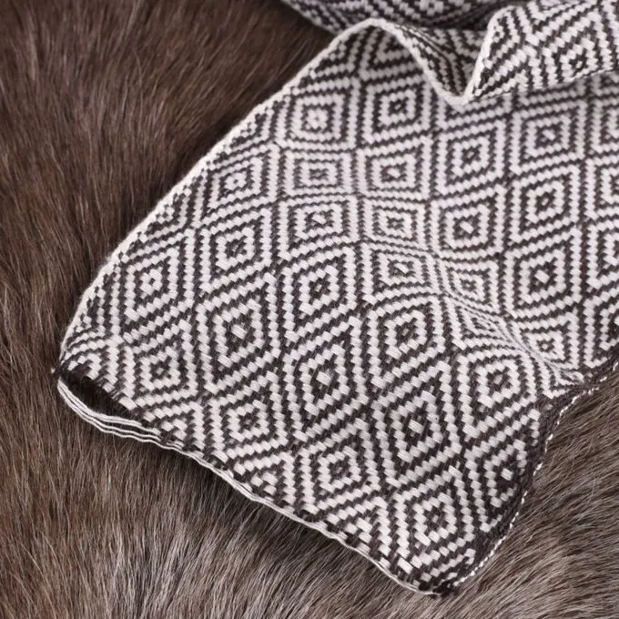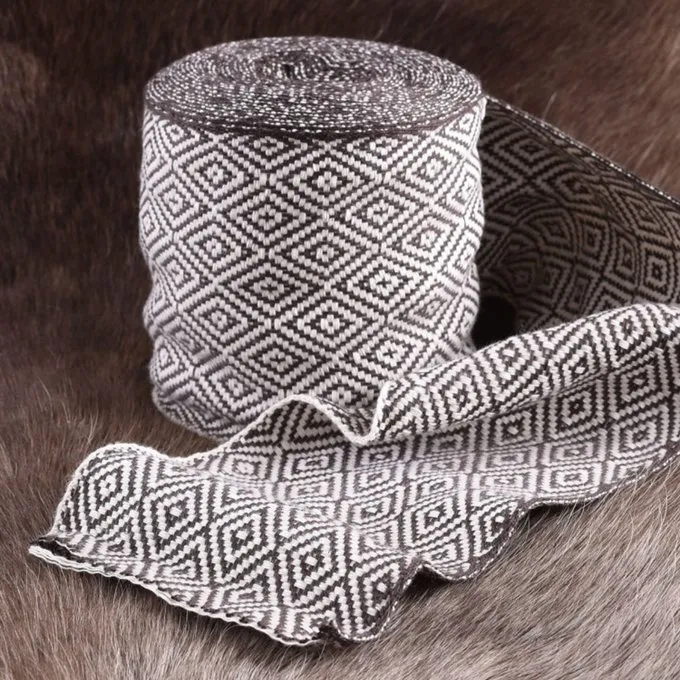 Der 10 cm breite Gewebestreifen wird auf einem zusätzlichen schmalen Webstuhl gewebt und hat daher sehr ordentlich fertiggestellte Kanten und ist in einem Twillmuster gewebt Diamanten. Der Diamant-Twill ist ein historisches Gewebe und sehr geeignet für die Herstellung von Reenactment Zubehör. Verkauft in Rollen von 7 Metern ist der Stoffstreifen perfekt für die eigene Bein Umhüllungen machen (7 Meter reichen für die Herstellung von 1 Paar), Riemen, verziert Ärmel und Bekleidungs Verzieren Säume. Diamant-Twill Stoffe waren ein Symbol für Status in den Früh- und Hochmittelalter.