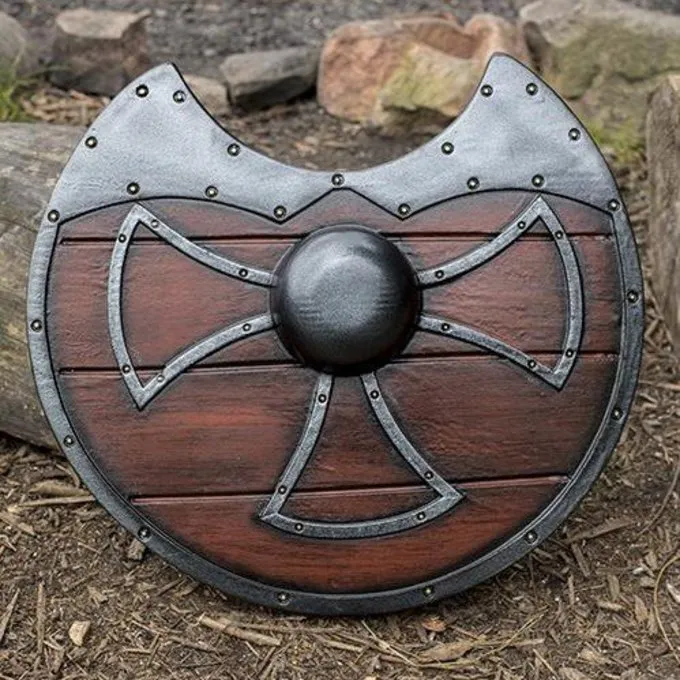 Dieses Larp Schild ist nach historischen Stücken gemacht. Diese LARP Schild ist handgefertigt und gefärbt, so dass jedes Stück ein Unikat ist. Aufgrund des Materials empfehlen wir nicht, es in der Sonne für längere Zeit verlassen.