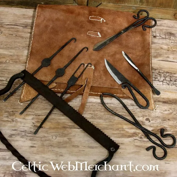 Diese Replik chirurgisches Set besteht aus einer Amputation Säge, eine Zange, Schere, drei Haken Schmutz (oder, beispielsweise Kugeln) aus der Wunde und zwei Skalpellen zu entfernen. Es wird inklusive Ledertasche geliefert.